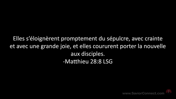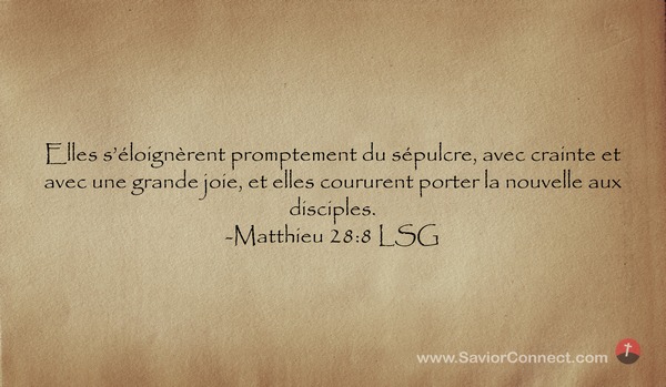 Elles s'éloignèrent promptement du sépulcre, avec crainte et avec une grande joie, et elles coururent porter la nouvelle aux disciples. -Matthieu 28:8 LSG