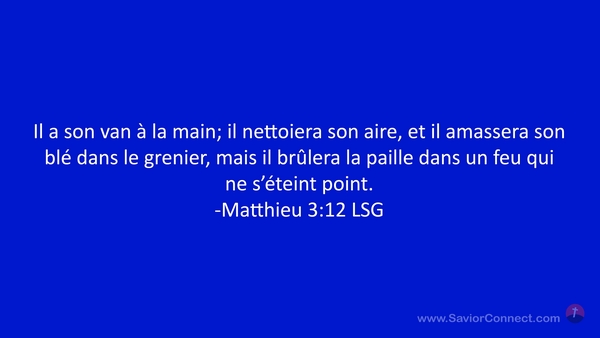 Il a son van à la main; il nettoiera son aire, et il amassera son blé dans le grenier, mais il brûlera la paille dans un feu qui ne s'éteint point. -Matthieu 3:12 LSG