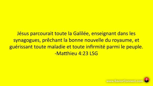 Jésus parcourait toute la Galilée, enseignant dans les synagogues, prêchant la bonne nouvelle du royaume, et guérissant toute maladie et toute infirmité parmi le peuple. -Matthieu 4:23 LSG