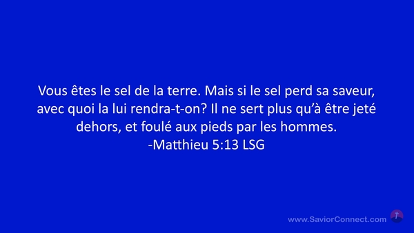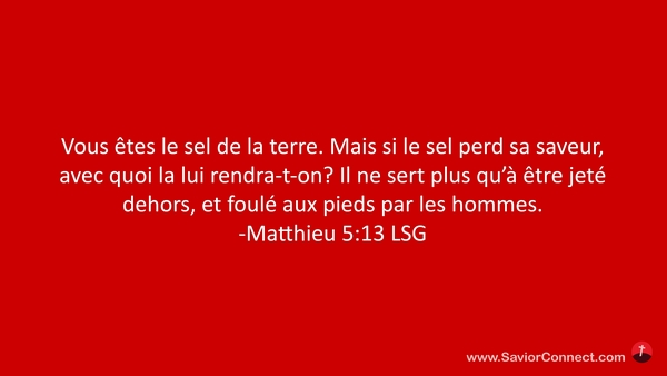 Vous êtes le sel de la terre. Mais si le sel perd sa saveur, avec quoi la lui rendra-t-on? Il ne sert plus qu'à être jeté dehors, et foulé aux pieds par les hommes. -Matthieu 5:13 LSG