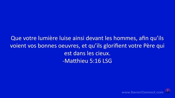 Que votre lumière luise ainsi devant les hommes, afin qu'ils voient vos bonnes oeuvres, et qu'ils glorifient votre Père qui est dans les cieux. -Matthieu 5:16 LSG