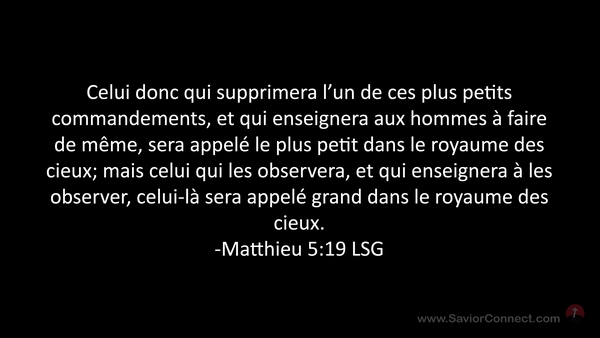 Celui donc qui supprimera l'un de ces plus petits commandements, et qui enseignera aux hommes à faire de même, sera appelé le plus petit dans le royaume des cieux; mais celui qui les observera, et qui enseignera à les observer, celui-là sera appelé grand dans le royaume des cieux. -Matthieu 5:19 LSG