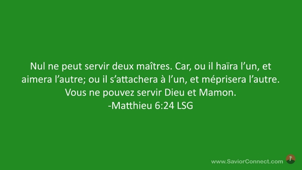 Nul ne peut servir deux maîtres. Car, ou il haïra l'un, et aimera l'autre; ou il s'attachera à l'un, et méprisera l'autre. Vous ne pouvez servir Dieu et Mamon. -Matthieu 6:24 LSG