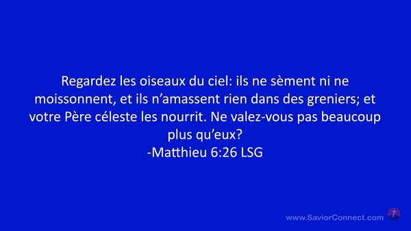 Regardez les oiseaux du ciel: ils ne sèment ni ne moissonnent, et ils n'amassent rien dans des greniers; et votre Père céleste les nourrit. Ne valez-vous pas beaucoup plus qu'eux? -Matthieu 6:26 LSG