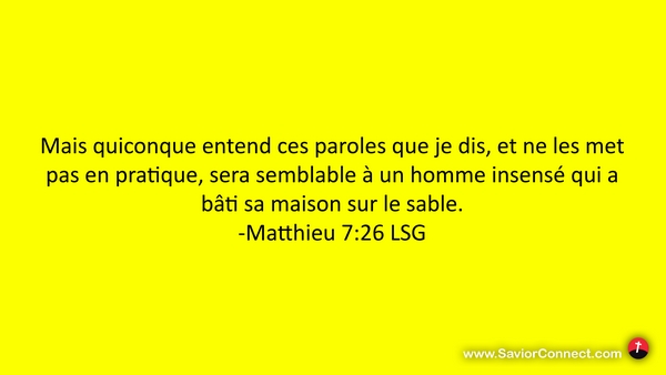 Mais quiconque entend ces paroles que je dis, et ne les met pas en pratique, sera semblable à un homme insensé qui a bâti sa maison sur le sable. -Matthieu 7:26 LSG