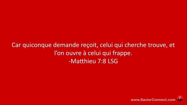 Car quiconque demande reçoit, celui qui cherche trouve, et l'on ouvre à celui qui frappe. -Matthieu 7:8 LSG