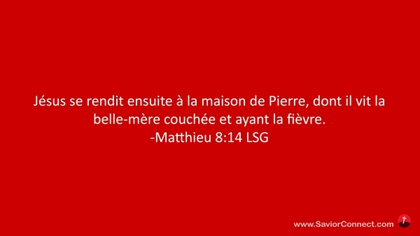 Jésus se rendit ensuite à la maison de Pierre, dont il vit la belle-mère couchée et ayant la fièvre. -Matthieu 8:14 LSG