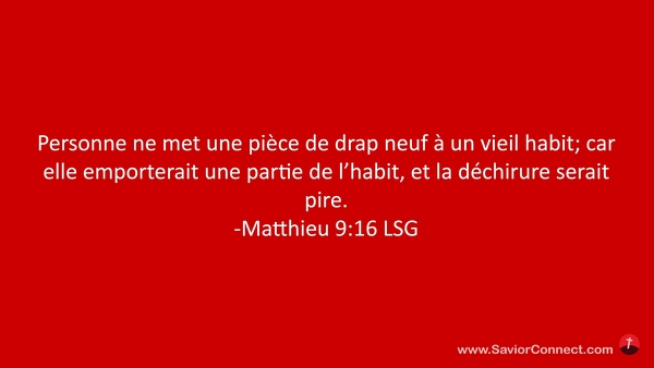 Personne ne met une pièce de drap neuf à un vieil habit; car elle emporterait une partie de l'habit, et la déchirure serait pire. -Matthieu 9:16 LSG