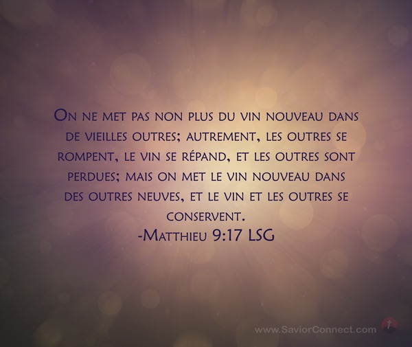 On ne met pas non plus du vin nouveau dans de vieilles outres; autrement, les outres se rompent, le vin se répand, et les outres sont perdues; mais on met le vin nouveau dans des outres neuves, et le vin et les outres se conservent. -Matthieu 9:17 LSG