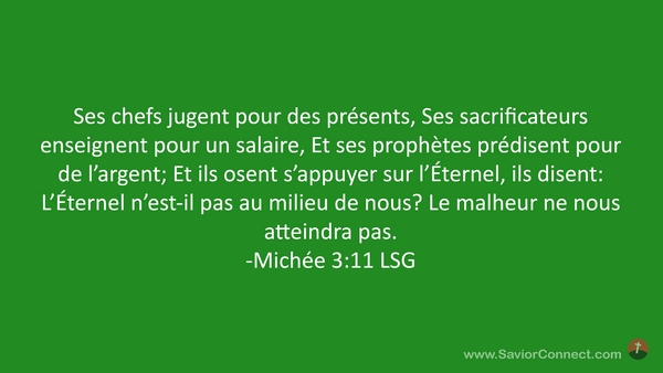 Ses chefs jugent pour des présents, Ses sacrificateurs enseignent pour un salaire, Et ses prophètes prédisent pour de l'argent; Et ils osent s'appuyer sur l'Éternel, ils disent: L'Éternel n'est-il pas au milieu de nous? Le malheur ne nous atteindra pas. -Michée 3:11 LSG