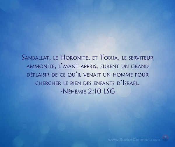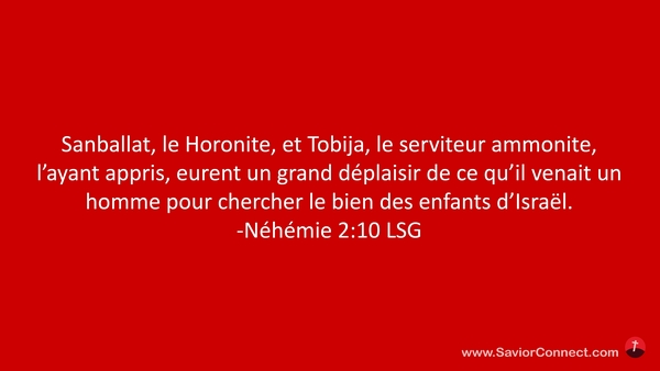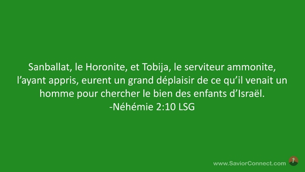 Sanballat, le Horonite, et Tobija, le serviteur ammonite, l'ayant appris, eurent un grand déplaisir de ce qu'il venait un homme pour chercher le bien des enfants d'Israël. -Néhémie 2:10 LSG