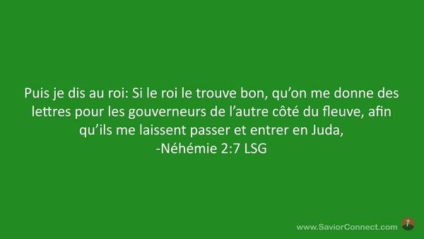 Puis je dis au roi: Si le roi le trouve bon, qu'on me donne des lettres pour les gouverneurs de l'autre côté du fleuve, afin qu'ils me laissent passer et entrer en Juda, -Néhémie 2:7 LSG
