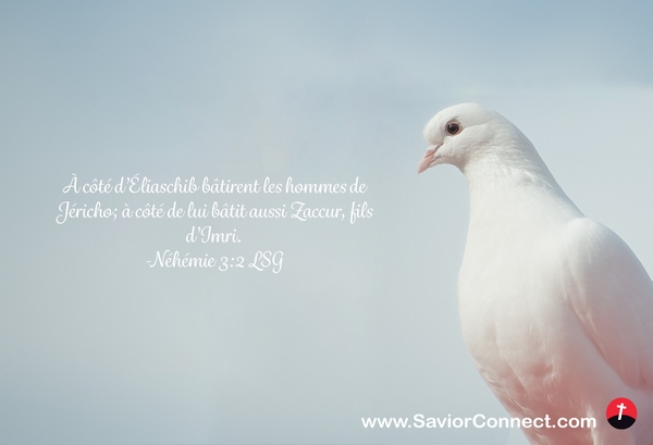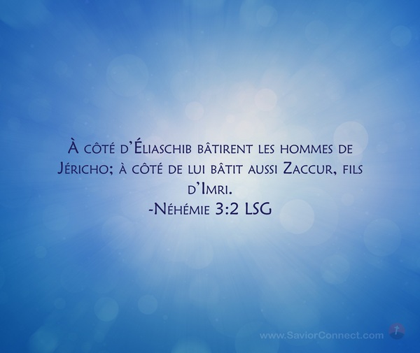 À côté d'Éliaschib bâtirent les hommes de Jéricho; à côté de lui bâtit aussi Zaccur, fils d'Imri. -Néhémie 3:2 LSG
