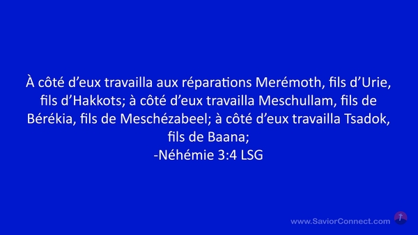 À côté d'eux travailla aux réparations Merémoth, fils d'Urie, fils d'Hakkots; à côté d'eux travailla Meschullam, fils de Bérékia, fils de Meschézabeel; à côté d'eux travailla Tsadok, fils de Baana; -Néhémie 3:4 LSG