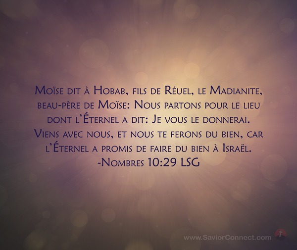 Moïse dit à Hobab, fils de Réuel, le Madianite, beau-père de Moïse: Nous partons pour le lieu dont l'Éternel a dit: Je vous le donnerai. Viens avec nous, et nous te ferons du bien, car l'Éternel a promis de faire du bien à Israël. -Nombres 10:29 LSG