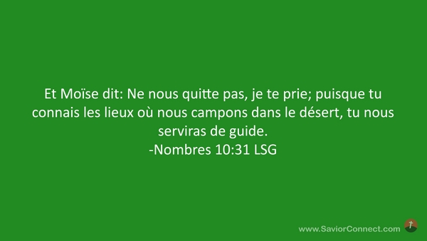 Et Moïse dit: Ne nous quitte pas, je te prie; puisque tu connais les lieux où nous campons dans le désert, tu nous serviras de guide. -Nombres 10:31 LSG