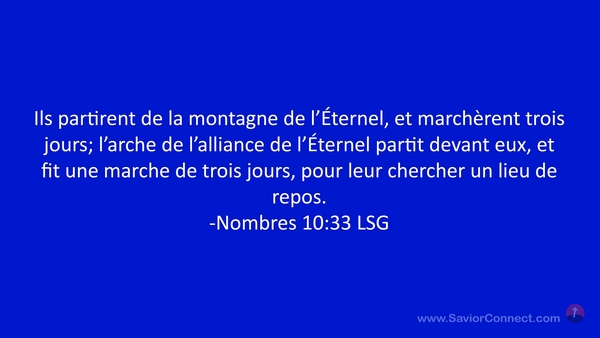 Ils partirent de la montagne de l'Éternel, et marchèrent trois jours; l'arche de l'alliance de l'Éternel partit devant eux, et fit une marche de trois jours, pour leur chercher un lieu de repos. -Nombres 10:33 LSG