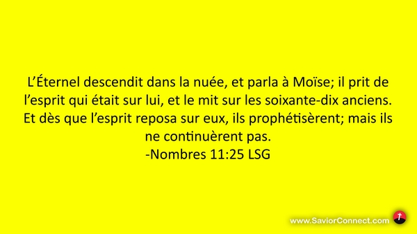 L'Éternel descendit dans la nuée, et parla à Moïse; il prit de l'esprit qui était sur lui, et le mit sur les soixante-dix anciens. Et dès que l'esprit reposa sur eux, ils prophétisèrent; mais ils ne continuèrent pas. -Nombres 11:25 LSG