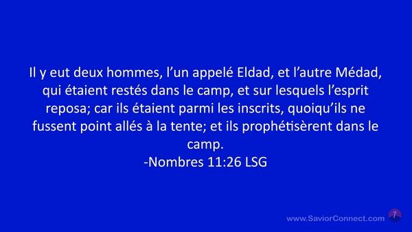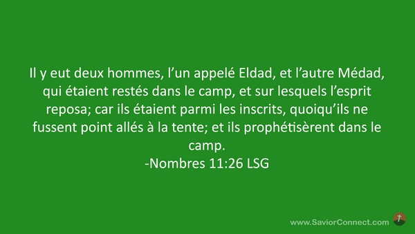 Il y eut deux hommes, l'un appelé Eldad, et l'autre Médad, qui étaient restés dans le camp, et sur lesquels l'esprit reposa; car ils étaient parmi les inscrits, quoiqu'ils ne fussent point allés à la tente; et ils prophétisèrent dans le camp. -Nombres 11:26 LSG