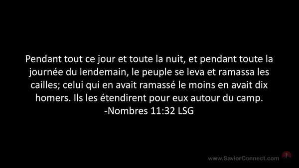 Pendant tout ce jour et toute la nuit, et pendant toute la journée du lendemain, le peuple se leva et ramassa les cailles; celui qui en avait ramassé le moins en avait dix homers. Ils les étendirent pour eux autour du camp. -Nombres 11:32 LSG