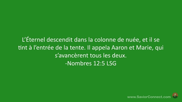 L'Éternel descendit dans la colonne de nuée, et il se tint à l'entrée de la tente. Il appela Aaron et Marie, qui s'avancèrent tous les deux. -Nombres 12:5 LSG