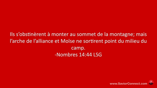 Ils s'obstinèrent à monter au sommet de la montagne; mais l'arche de l'alliance et Moïse ne sortirent point du milieu du camp. -Nombres 14:44 LSG