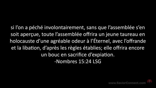 si l'on a péché involontairement, sans que l'assemblée s'en soit aperçue, toute l'assemblée offrira un jeune taureau en holocauste d'une agréable odeur à l'Éternel, avec l'offrande et la libation, d'après les règles établies; elle offrira encore un bouc en sacrifice d'expiation. -Nombres 15:24 LSG