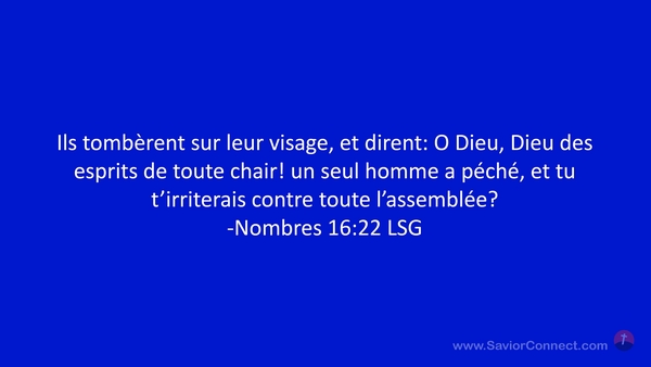 Ils tombèrent sur leur visage, et dirent: O Dieu, Dieu des esprits de toute chair! un seul homme a péché, et tu t'irriterais contre toute l'assemblée? -Nombres 16:22 LSG