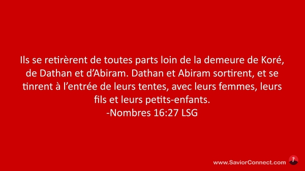 Ils se retirèrent de toutes parts loin de la demeure de Koré, de Dathan et d'Abiram. Dathan et Abiram sortirent, et se tinrent à l'entrée de leurs tentes, avec leurs femmes, leurs fils et leurs petits-enfants. -Nombres 16:27 LSG