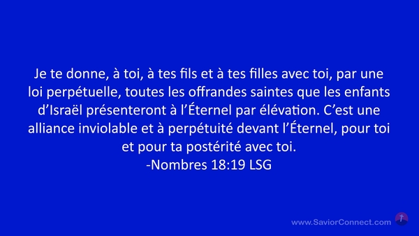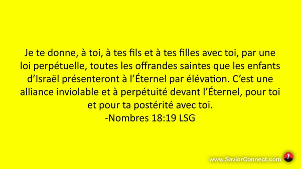 Je te donne, à toi, à tes fils et à tes filles avec toi, par une loi perpétuelle, toutes les offrandes saintes que les enfants d'Israël présenteront à l'Éternel par élévation. C'est une alliance inviolable et à perpétuité devant l'Éternel, pour toi et pour ta postérité avec toi. -Nombres 18:19 LSG
