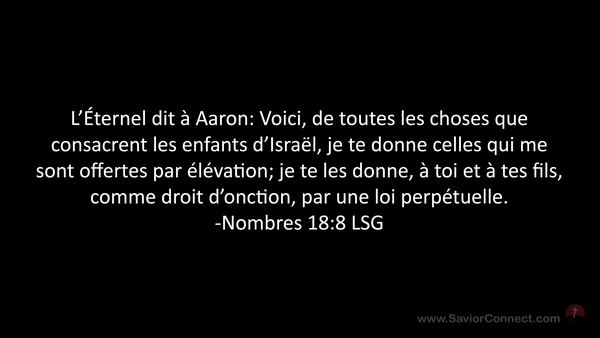 L'Éternel dit à Aaron: Voici, de toutes les choses que consacrent les enfants d'Israël, je te donne celles qui me sont offertes par élévation; je te les donne, à toi et à tes fils, comme droit d'onction, par une loi perpétuelle. -Nombres 18:8 LSG
