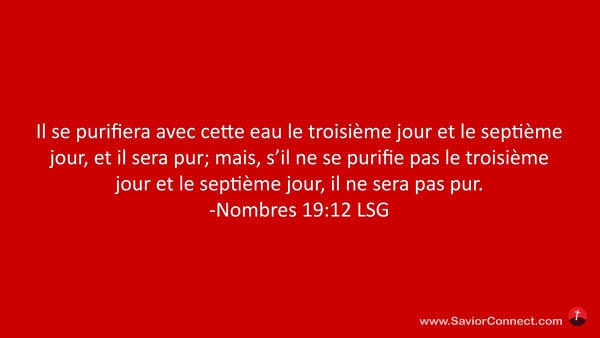 Il se purifiera avec cette eau le troisième jour et le septième jour, et il sera pur; mais, s'il ne se purifie pas le troisième jour et le septième jour, il ne sera pas pur. -Nombres 19:12 LSG
