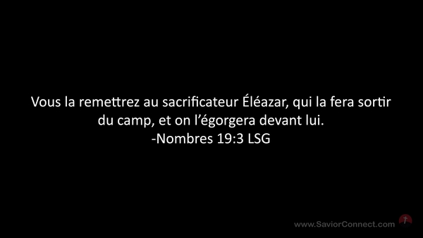 Vous la remettrez au sacrificateur Éléazar, qui la fera sortir du camp, et on l'égorgera devant lui. -Nombres 19:3 LSG