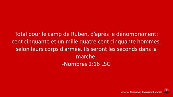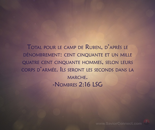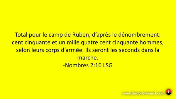 Total pour le camp de Ruben, d'après le dénombrement: cent cinquante et un mille quatre cent cinquante hommes, selon leurs corps d'armée. Ils seront les seconds dans la marche. -Nombres 2:16 LSG