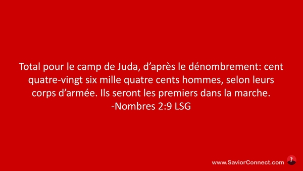 Total pour le camp de Juda, d'après le dénombrement: cent quatre-vingt six mille quatre cents hommes, selon leurs corps d'armée. Ils seront les premiers dans la marche. -Nombres 2:9 LSG
