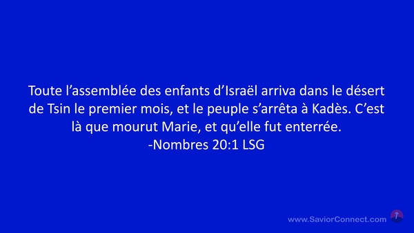 Toute l'assemblée des enfants d'Israël arriva dans le désert de Tsin le premier mois, et le peuple s'arrêta à Kadès. C'est là que mourut Marie, et qu'elle fut enterrée. -Nombres 20:1 LSG