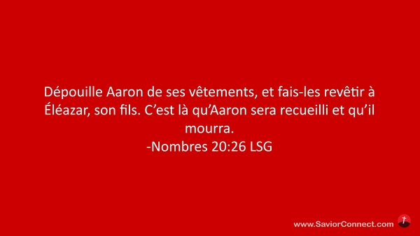 Dépouille Aaron de ses vêtements, et fais-les revêtir à Éléazar, son fils. C'est là qu'Aaron sera recueilli et qu'il mourra. -Nombres 20:26 LSG