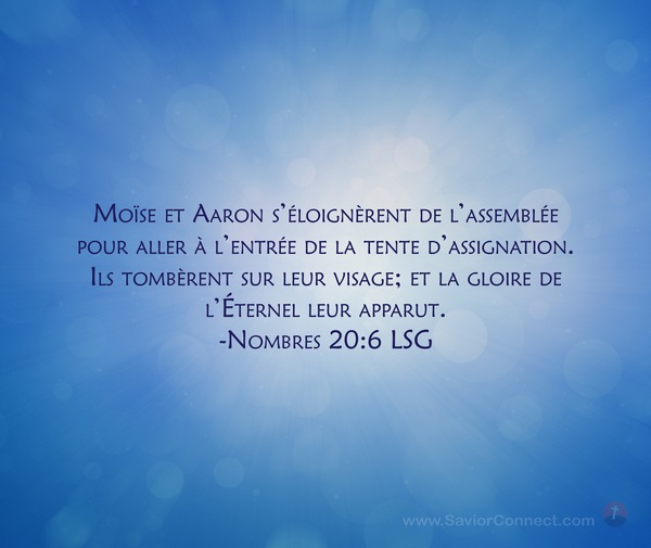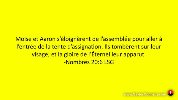 Moïse et Aaron s'éloignèrent de l'assemblée pour aller à l'entrée de la tente d'assignation. Ils tombèrent sur leur visage; et la gloire de l'Éternel leur apparut. -Nombres 20:6 LSG