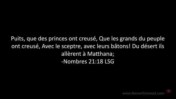 Puits, que des princes ont creusé, Que les grands du peuple ont creusé, Avec le sceptre, avec leurs bâtons! Du désert ils allèrent à Matthana; -Nombres 21:18 LSG
