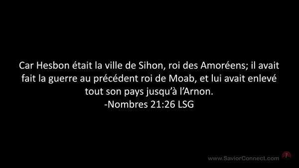 Car Hesbon était la ville de Sihon, roi des Amoréens; il avait fait la guerre au précédent roi de Moab, et lui avait enlevé tout son pays jusqu'à l'Arnon. -Nombres 21:26 LSG