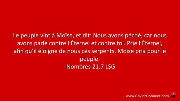 Le peuple vint à Moïse, et dit: Nous avons péché, car nous avons parlé contre l'Éternel et contre toi. Prie l'Éternel, afin qu'il éloigne de nous ces serpents. Moïse pria pour le peuple. -Nombres 21:7 LSG
