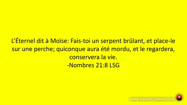 L'Éternel dit à Moïse: Fais-toi un serpent brûlant, et place-le sur une perche; quiconque aura été mordu, et le regardera, conservera la vie. -Nombres 21:8 LSG