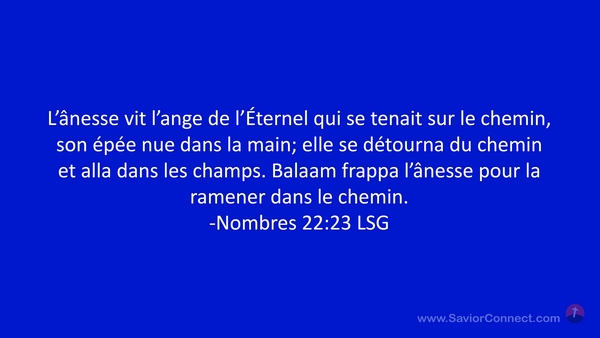 L'ânesse vit l'ange de l'Éternel qui se tenait sur le chemin, son épée nue dans la main; elle se détourna du chemin et alla dans les champs. Balaam frappa l'ânesse pour la ramener dans le chemin. -Nombres 22:23 LSG