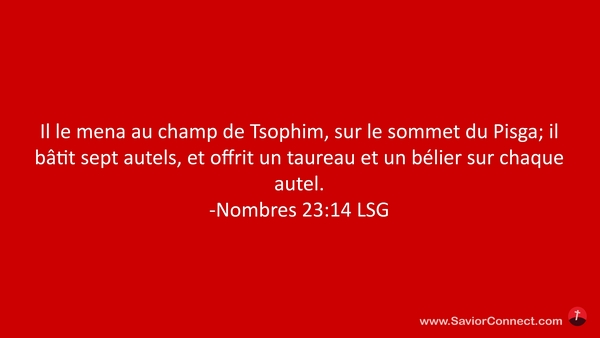 Il le mena au champ de Tsophim, sur le sommet du Pisga; il bâtit sept autels, et offrit un taureau et un bélier sur chaque autel. -Nombres 23:14 LSG