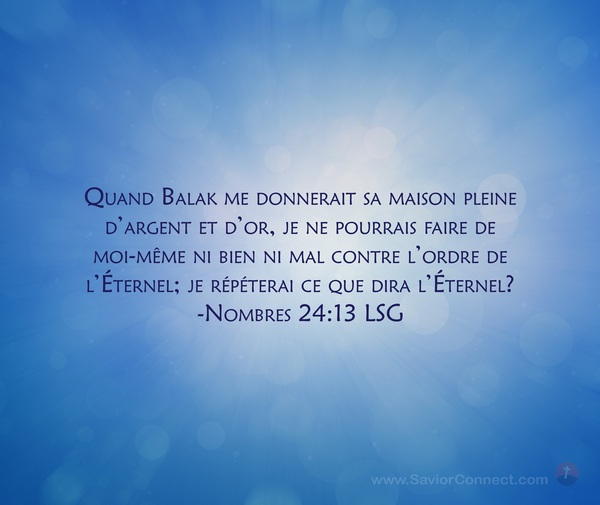 Quand Balak me donnerait sa maison pleine d'argent et d'or, je ne pourrais faire de moi-même ni bien ni mal contre l'ordre de l'Éternel; je répéterai ce que dira l'Éternel? -Nombres 24:13 LSG