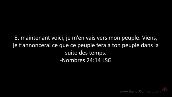 Et maintenant voici, je m'en vais vers mon peuple. Viens, je t'annoncerai ce que ce peuple fera à ton peuple dans la suite des temps. -Nombres 24:14 LSG