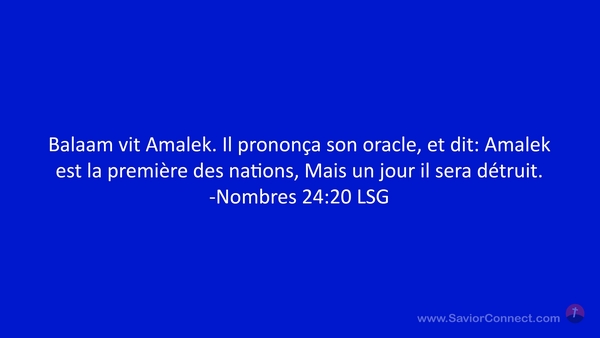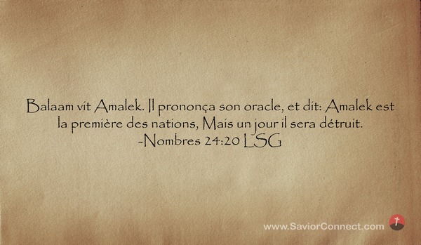 Balaam vit Amalek. Il prononça son oracle, et dit: Amalek est la première des nations, Mais un jour il sera détruit. -Nombres 24:20 LSG