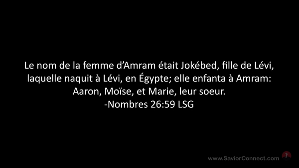 Le nom de la femme d'Amram était Jokébed, fille de Lévi, laquelle naquit à Lévi, en Égypte; elle enfanta à Amram: Aaron, Moïse, et Marie, leur soeur. -Nombres 26:59 LSG