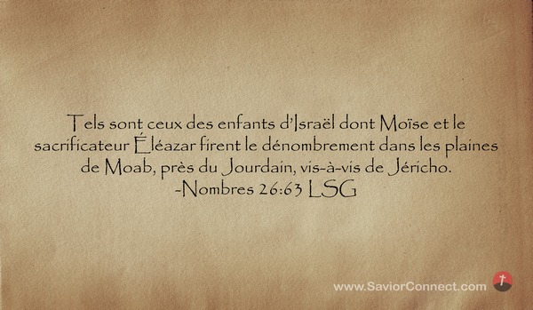 Tels sont ceux des enfants d'Israël dont Moïse et le sacrificateur Éléazar firent le dénombrement dans les plaines de Moab, près du Jourdain, vis-à-vis de Jéricho. -Nombres 26:63 LSG