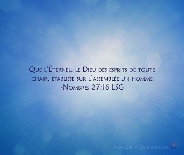 Que l'Éternel, le Dieu des esprits de toute chair, établisse sur l'assemblée un homme -Nombres 27:16 LSG